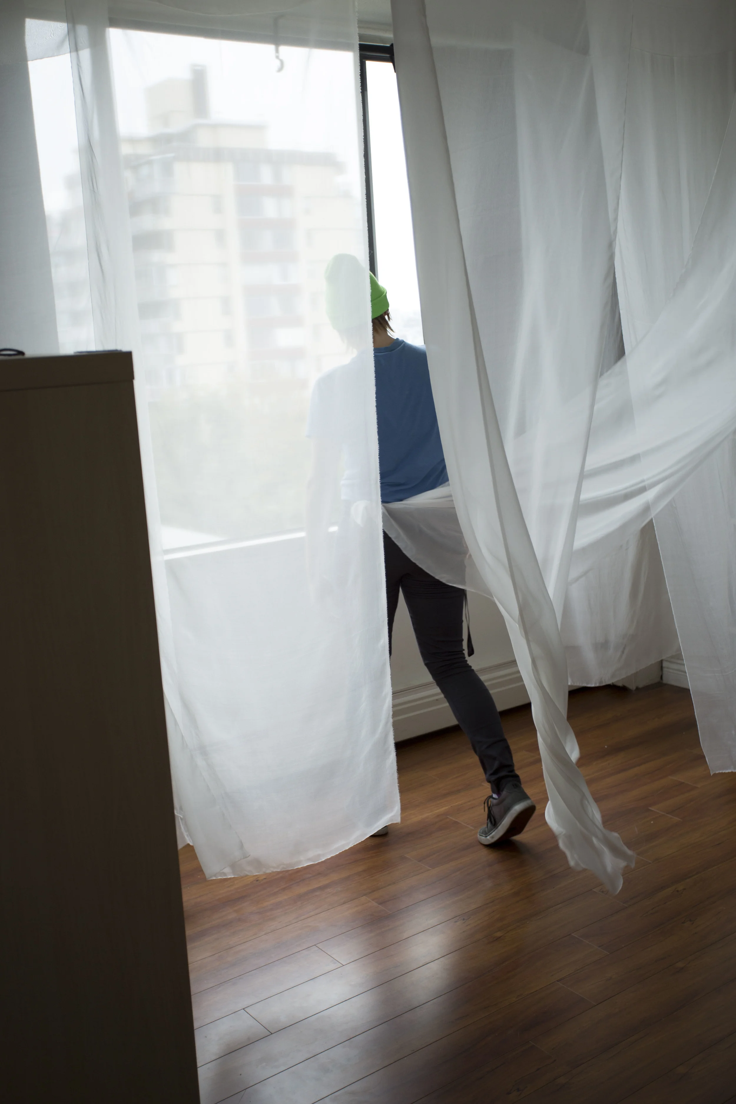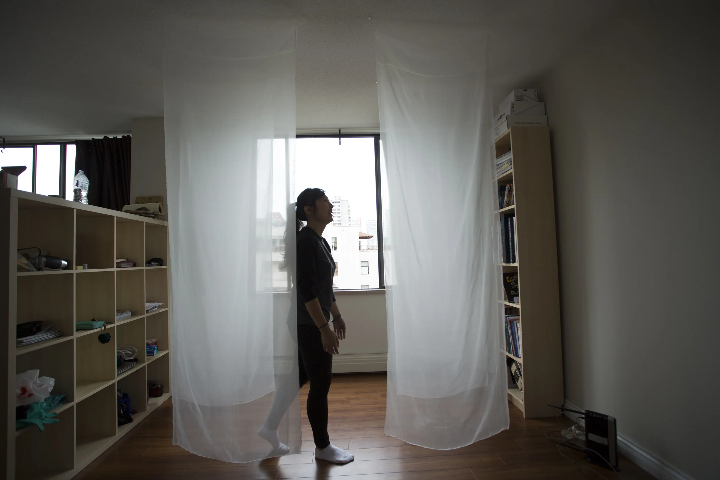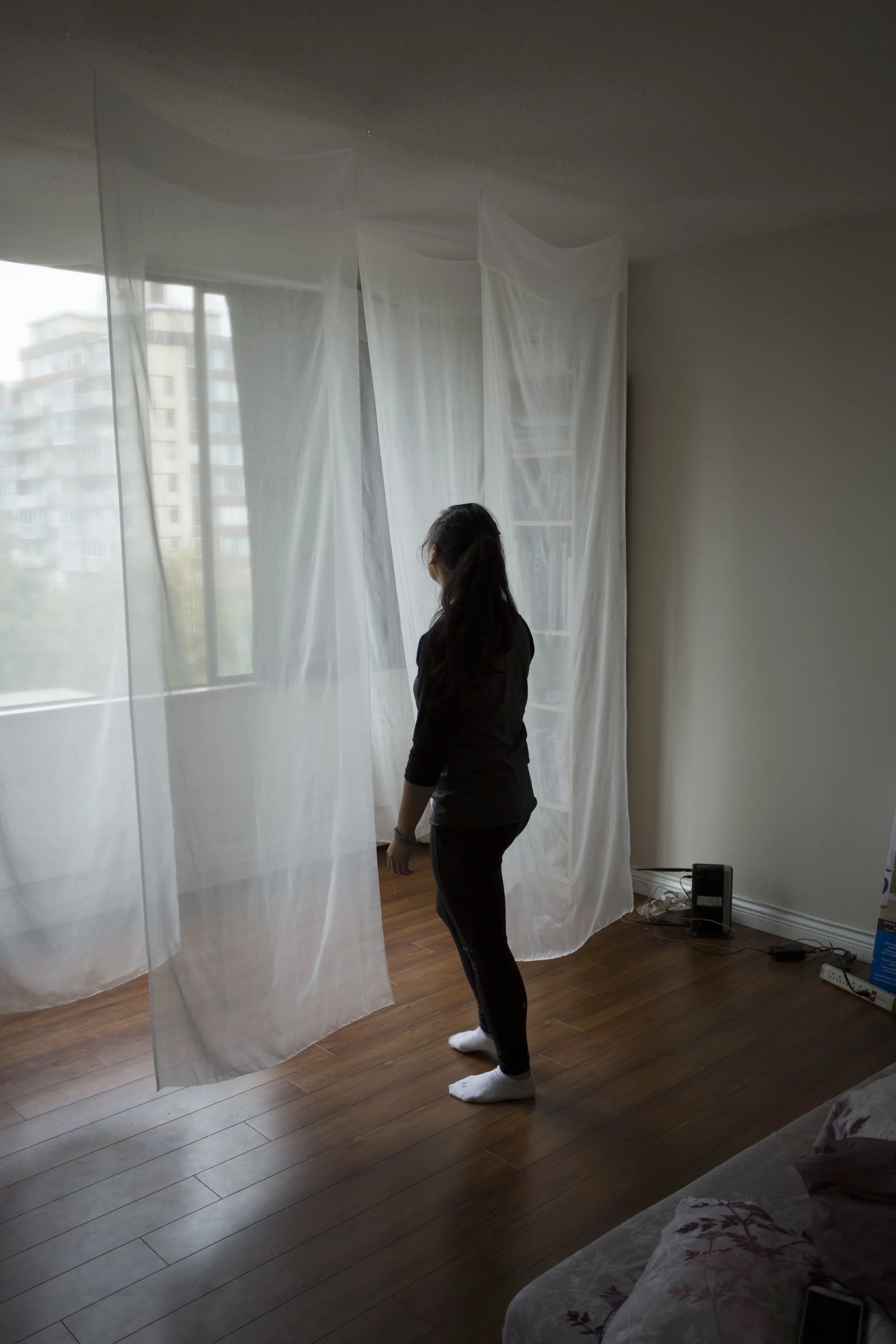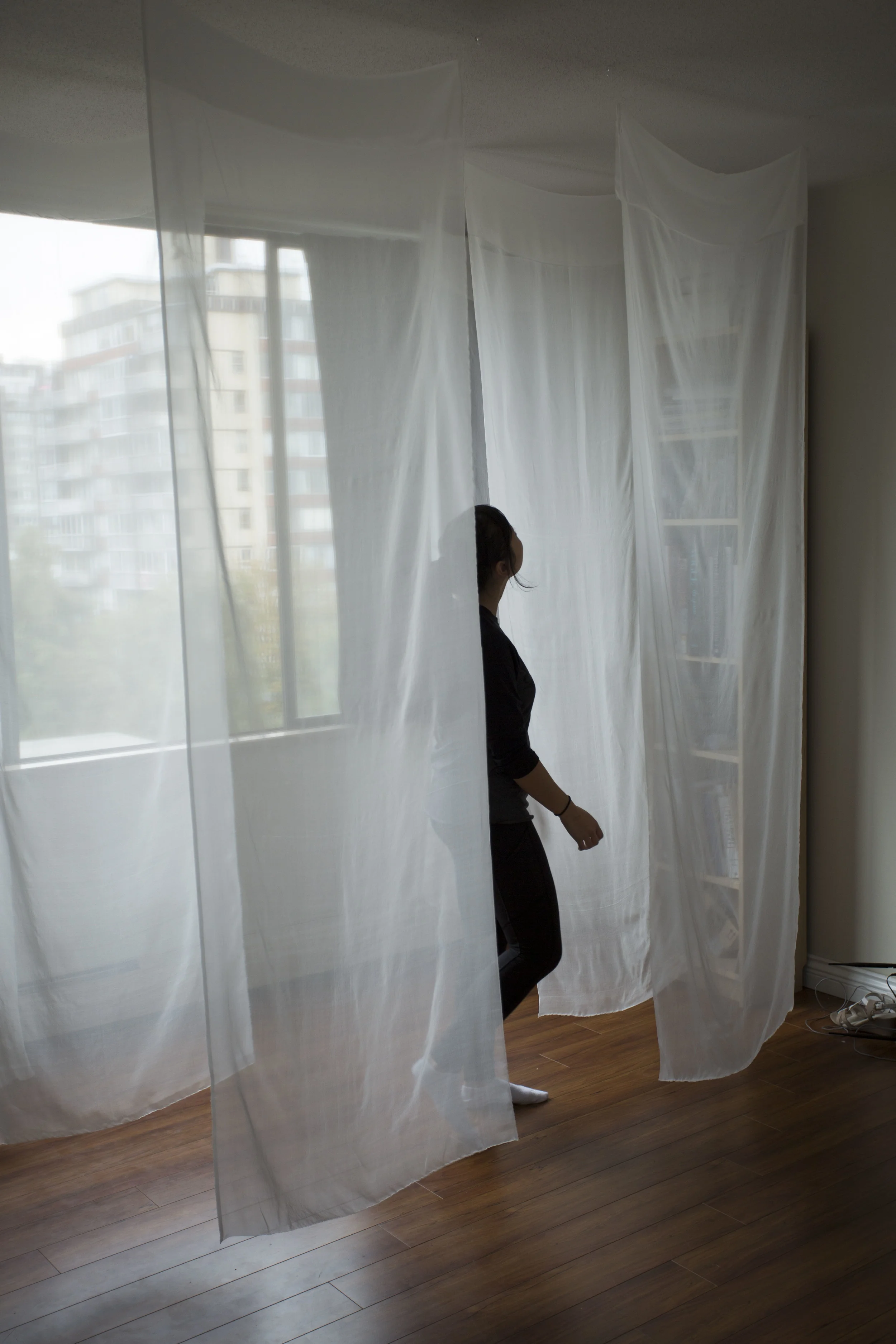 A simulation of the feeling matched by looking into the windows of others. Movement through the silk causes the fabric to move and sway, making the viewer significantly more aware of their presence in relation to the window as well as the fabric around them.