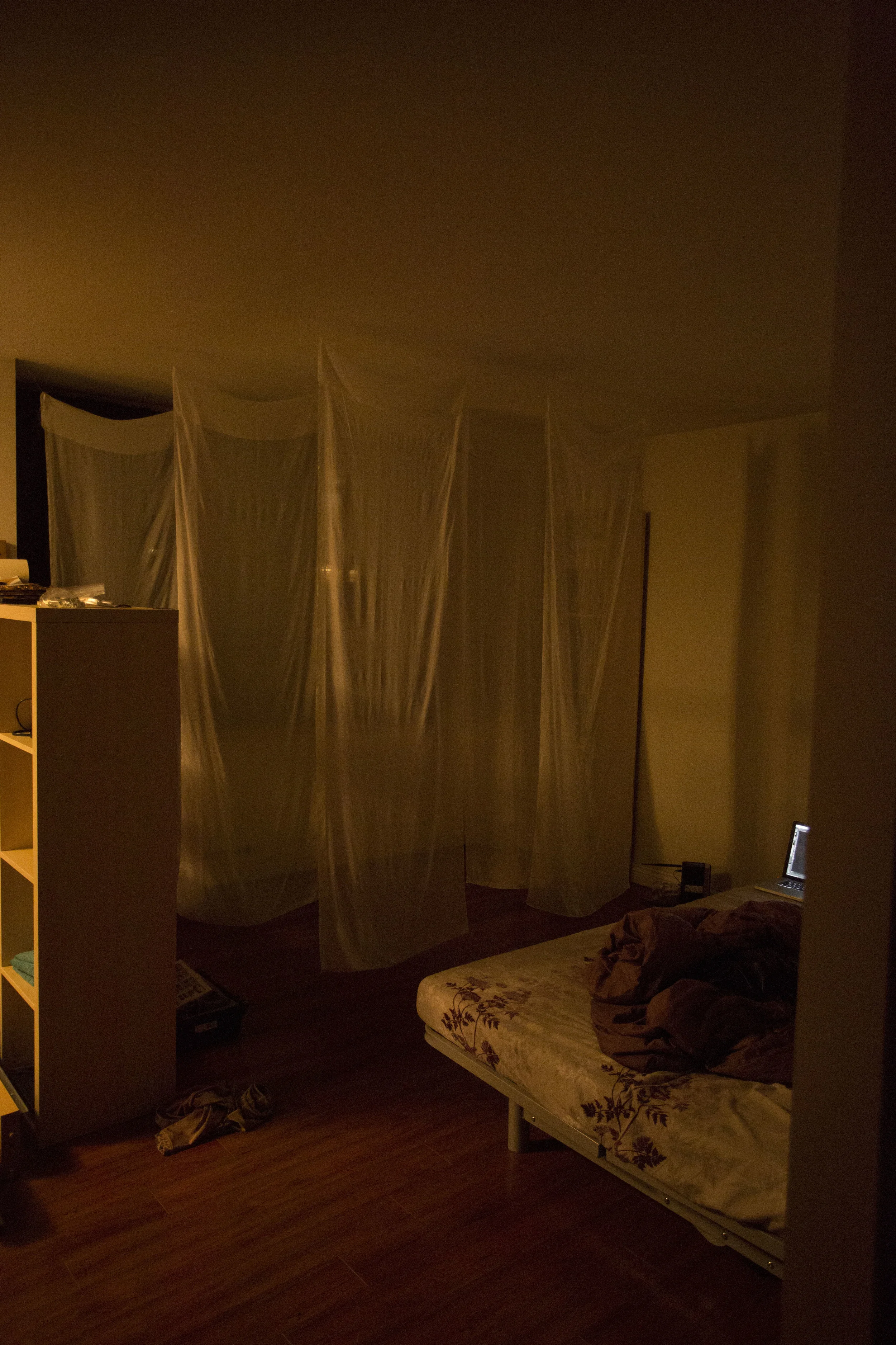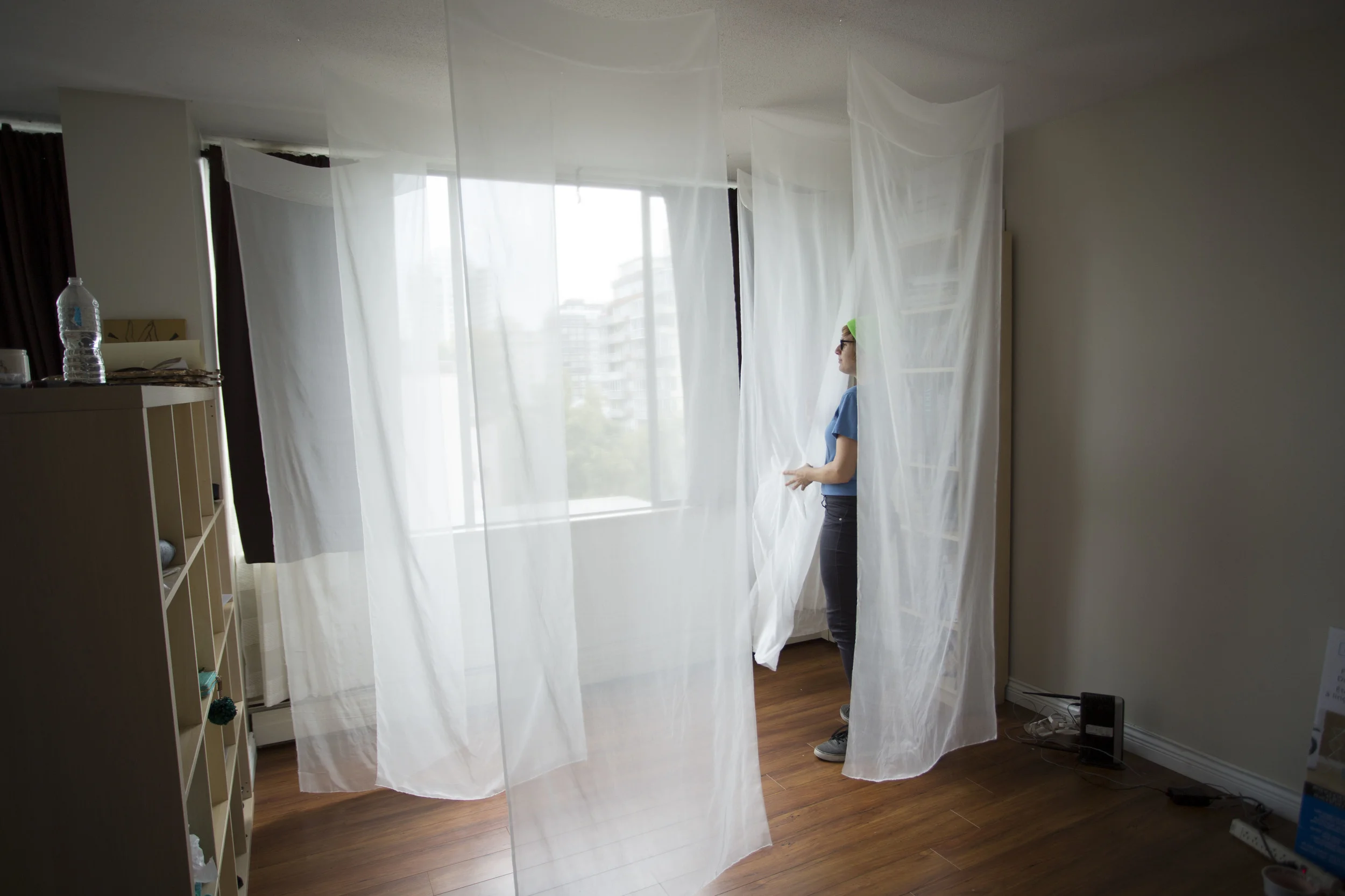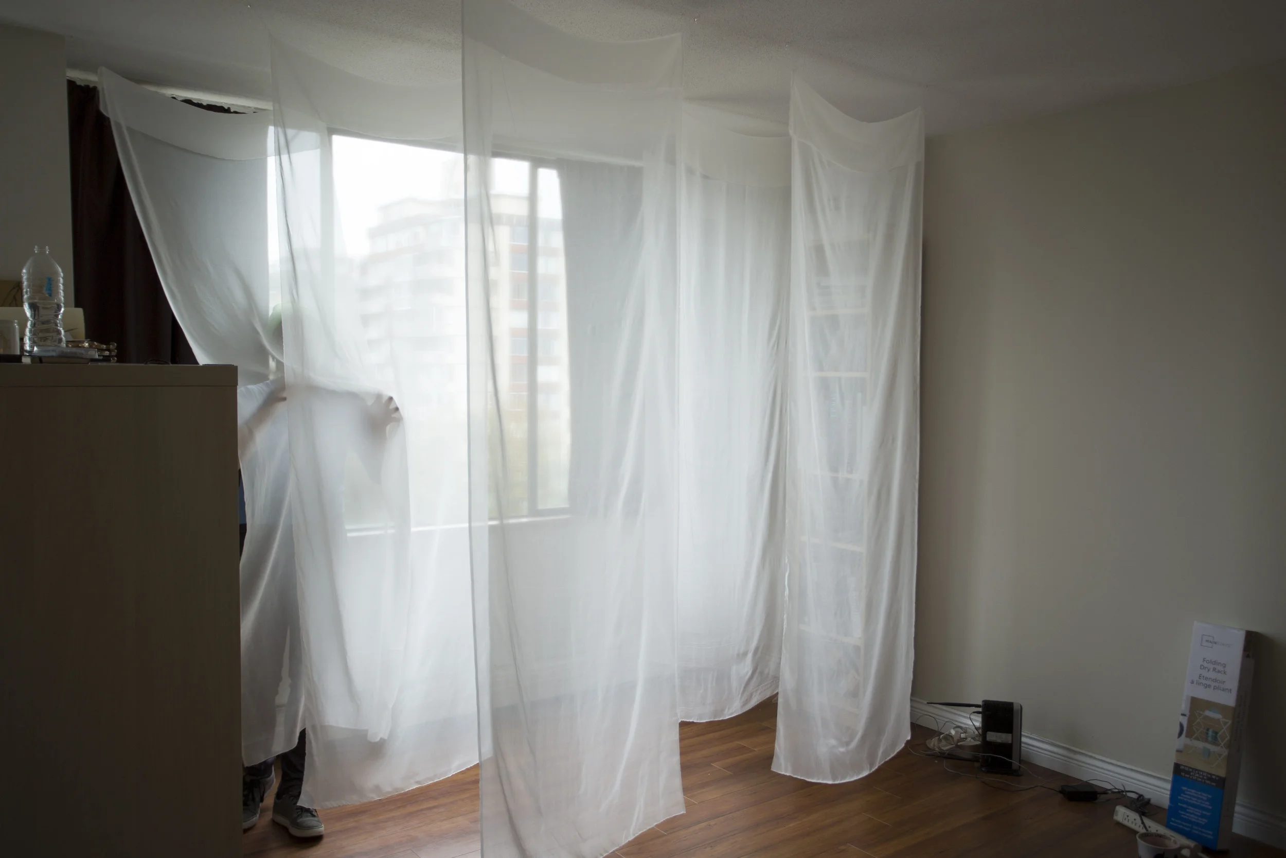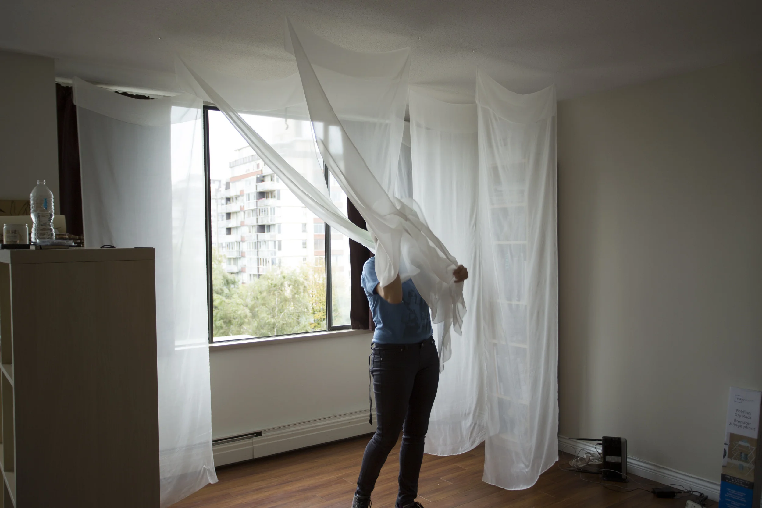 A simulation of the feeling matched by looking into the windows of others. Movement through the silk causes the fabric to move and sway, making the viewer significantly more aware of their presence in relation to the window as well as the fabric around them.